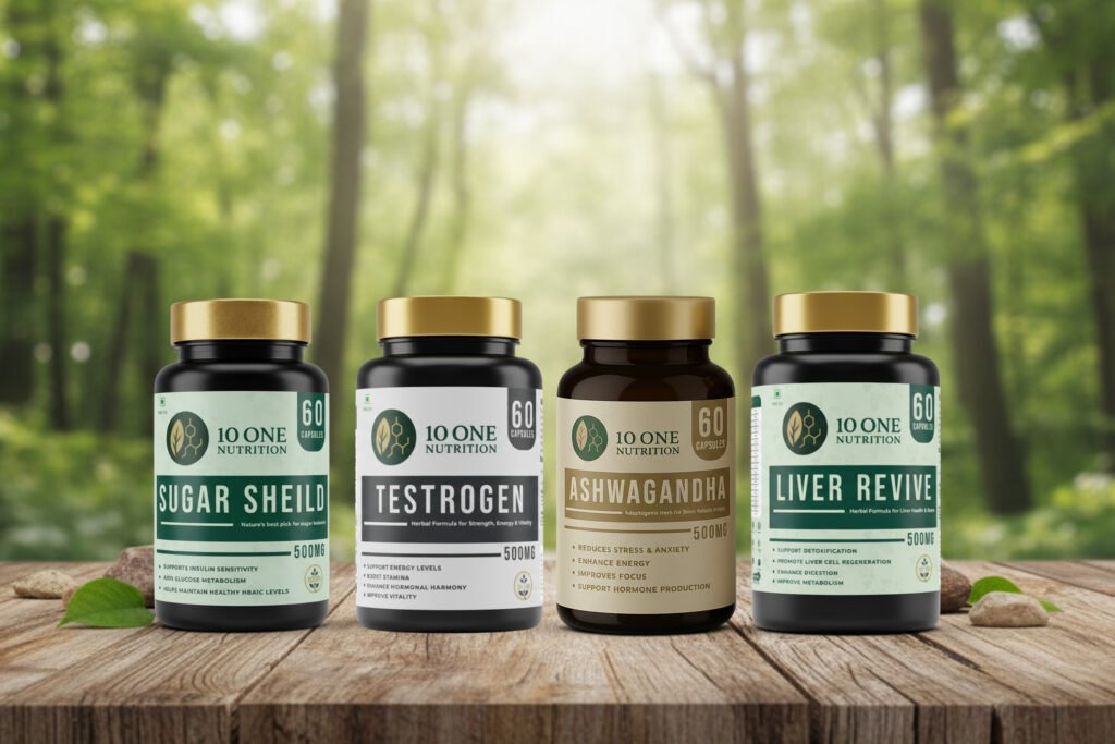 Targeted daily capsules for liver health, testosterone support, diabetes care, and stress relief with ashwagandha.